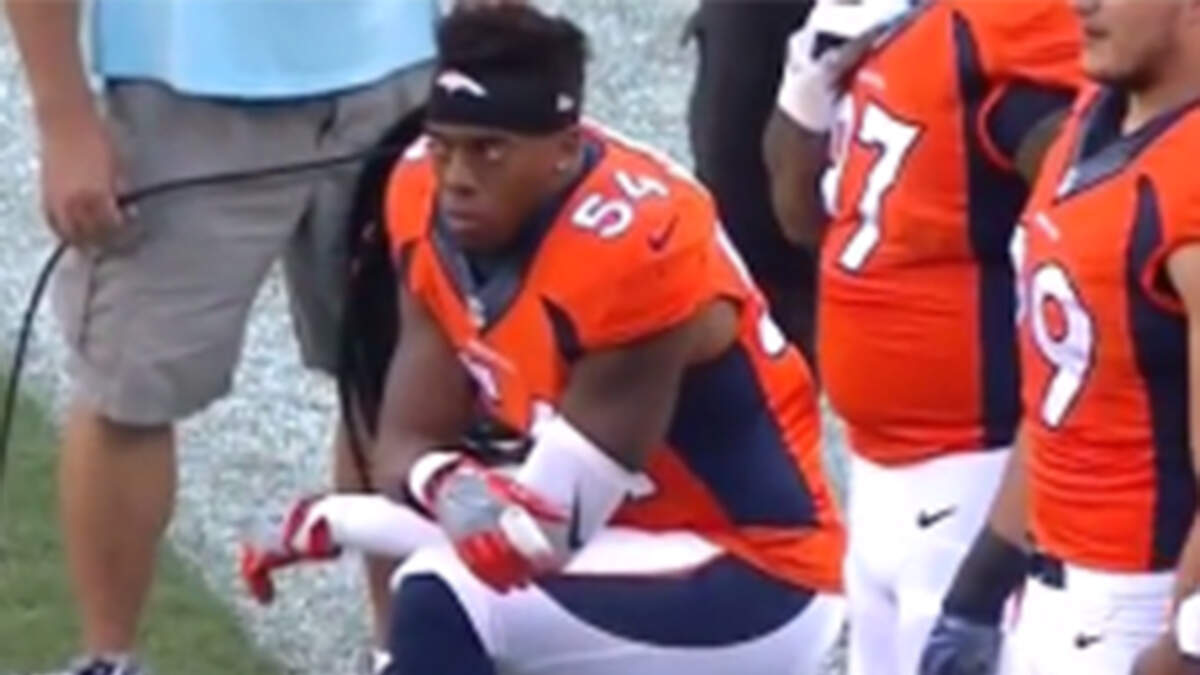 Denver Broncos linebacker Brandon Marshall joined Colin Kaepernick in refusing to stand for the national anthem during the first NFL regular-season game against the Carolina Panthers.
