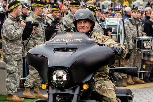 In 2015, LTG Caslen led his team onto the field riding a custom-made Orange County Choppers motorcycle.
