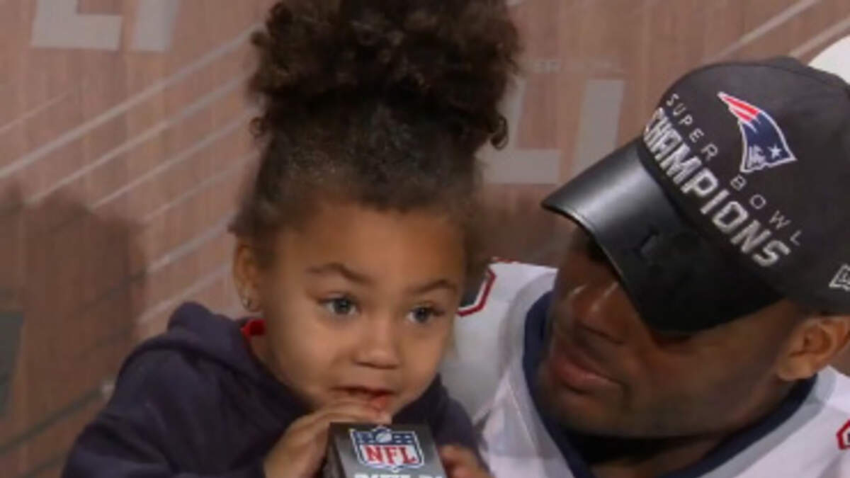 Following a miraculous comeback to win Super Bowl LI, Patriots tight-end Martellus Bennett fielded some questions from the press. He wasn't alone to face the press, he had his three-year-old daughter Jett with him and she stole the show.
