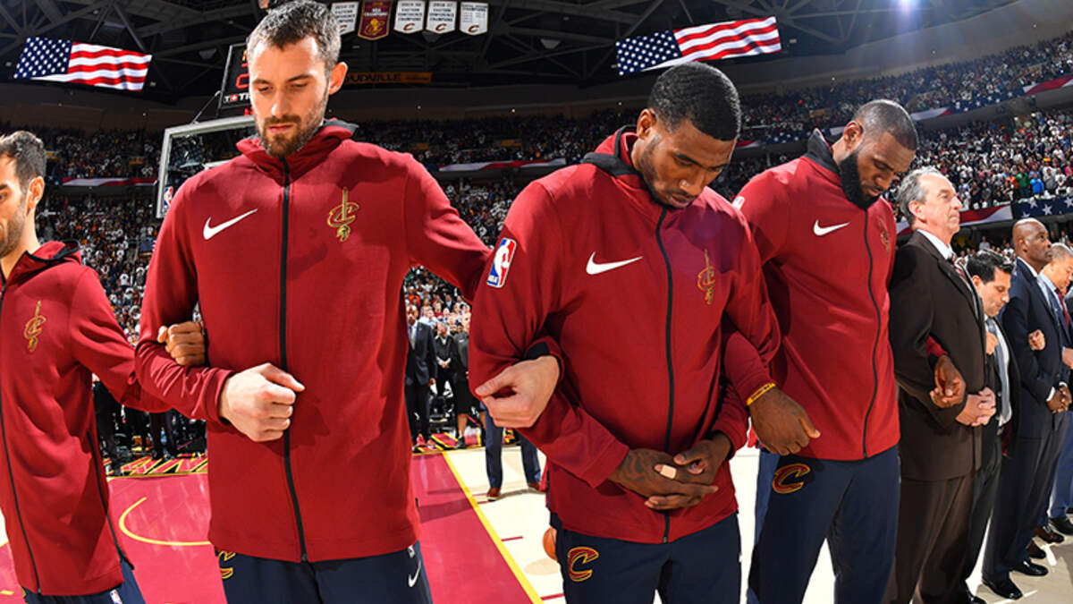 Not a single player knelt during the national anthem, but the entire Cavs team locked arms and bowed their heads as a U.S. service member sang the national anthem.