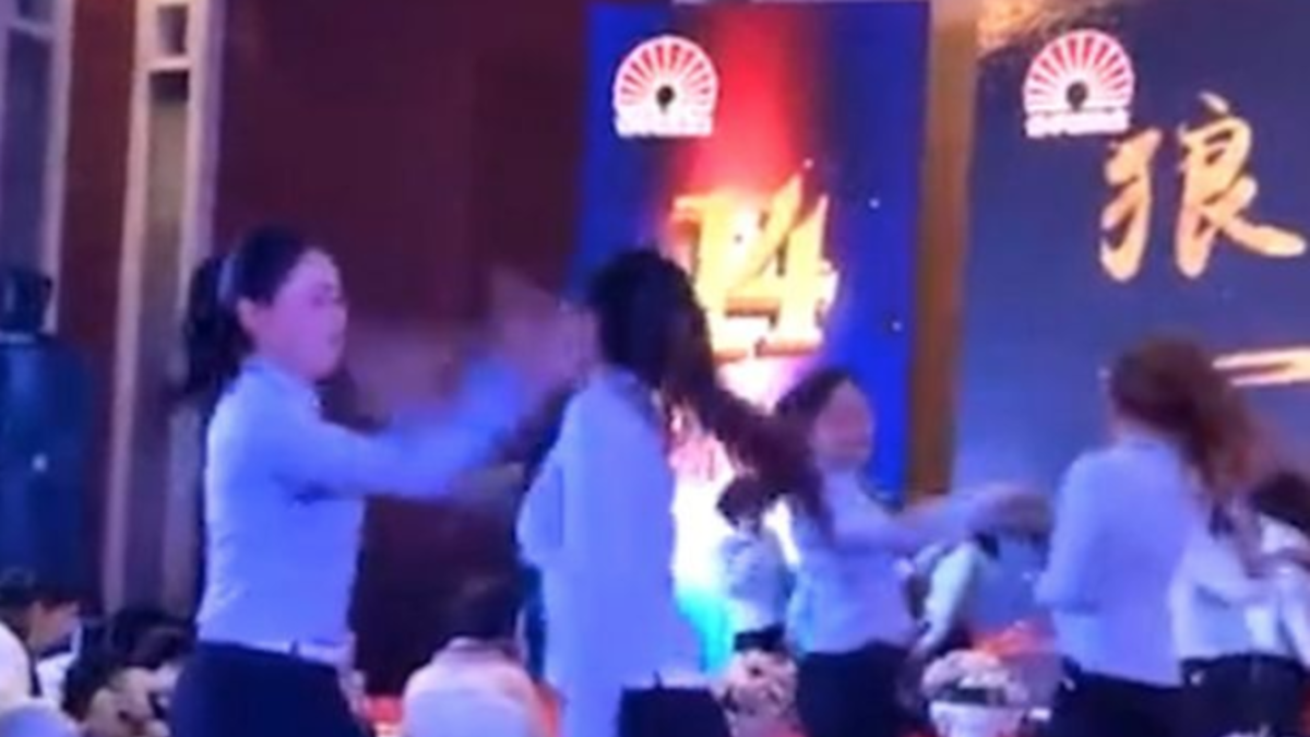 The slapping took place on a stage in front of hundreds of people at the event, which celebrated Nanchang Jinhuayuan Meiye's 14th anniversary. On the screen behind the women was the phrase "Ruthless Team."