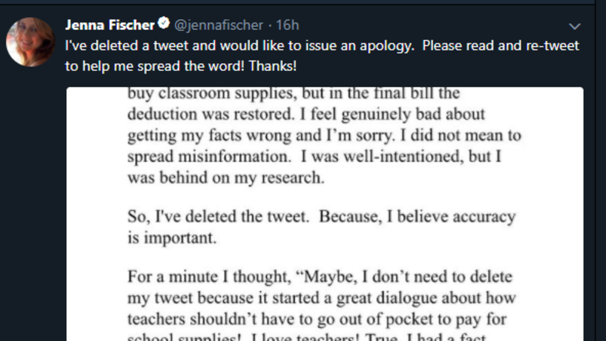 Jenna Fischer won praise from Republicans Wednesday for admitting she got her facts wrong in a tweet about the GOP tax bill. The actress, best known for her role as Pam in The Office, had said that the bill stops teachers deducting the cost of classroom supplies they paid for, Mediaite reports.