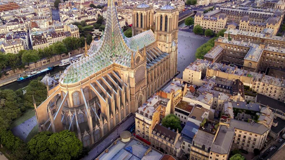 The Vincent Callebaut project is titled "Palingenesis," a Greek concept of rebirth or recreation. The firm proposes a new roof made of glass, oak and carbon fiber, which connects "in one single curved stroke of pencil" to the sloping spire. The rooster which topped the original spire, retrieved from the rubble after the fire, will resume its watch from the new glass design, while the cathedral's choir will be "bathed in natural light."